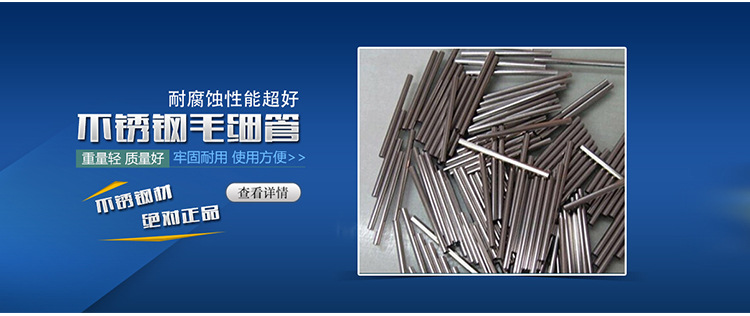 生产各种规格不锈钢毛细管、不锈钢吸管,常年备有各种规格库存,可定做各种规格、不同材质的不锈钢毛细管、不锈钢吸管、并可提供各种封口加工,封圆口、平口、削尖、折弯、攻牙、打孔、翻边、扩口等加工。公司有完整的生产线,有大型的淬火炉,氢退炉,来满足客户对毛细管硬度不同的要求。